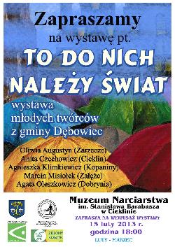 Na wystawie zostaną zaprezentowane prace: Oliwi Augustyn z Zarzecza Anity Czechowicz z Cieklina, Agnieszki Klimkiewicz z Kopanin, Marcina Misiołek z Załęża, Agaty Oleszkowicz z Dobryni.