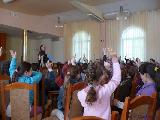 Twórca niezrównanej serii o bliźniakach Kubie i Bubie i równie dobrze znanych przygód Detektywa Pozytywki już od samego początku podbił serca młodych czytelników. Było więc sto lat - z okazji niedawnych urodzin autora, próby polizania swojego! łokcia, było rozwiązywanie zagadek z detektywem Pozytywką i odgadywanie znaczeń powiedzeń z bliźniakami Kubą i Bubą. Dzieci dowiedziały się jak to jest być pisarzem, który jednocześnie jest i na wakacjach i w pracy. Na wakacjach, bo nie musi podpisywać listy obecności i codziennie chodzić do fabryki. W pracy - bo nawet jak wyjeżdża w góry czy nad morze, bierze ze sobą komputer i pisze a pisząc wciela się w bohatera swojej książki, więc niejako żyje pod innymi postaciami. Była też okazja do poznania innych książek autora -w tym nowości, której jeszcze nie ma w księgarniach. Padło sporo pytań, dotyczących nie tylko zawodu pisarza, ale i jego prywatnego życia. Na wszystkie pan Grzegorz odpowiedział, a na koniec spotkania rozdał mnóstwo autografów i pozował do pamiątkowego zdjęcia.